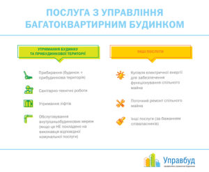 - Клінінгові послуги. До них відносяться прибирання прибудинкової території; сходів та сходових майданчиків; підвалів, технічного підпілля, горищ, технічних поверхів, технічних приміщень та приміщень спеціального призначення.